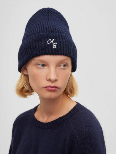 Шапка в рубчик с отворотом и с контрастной вышивкой по переду.