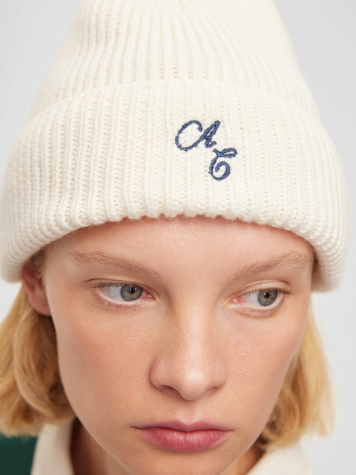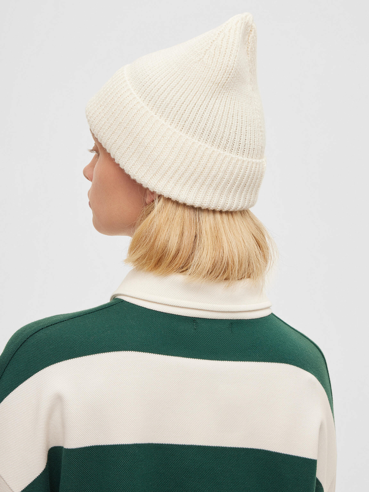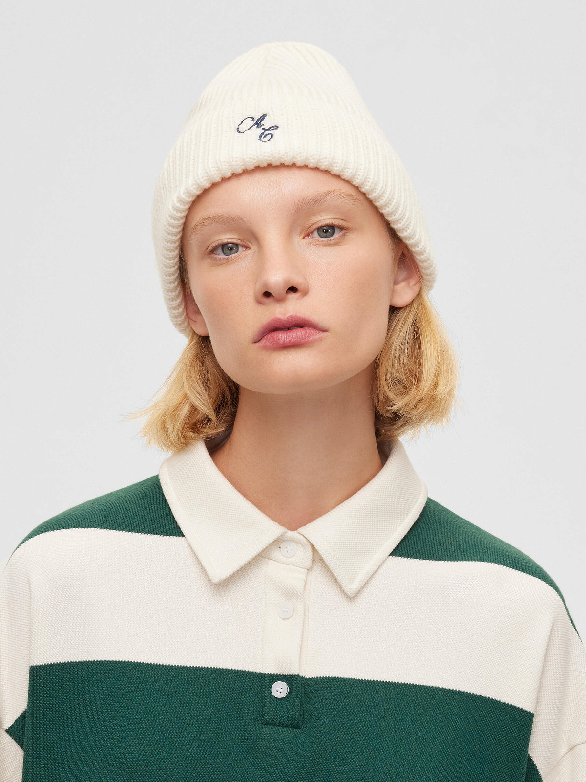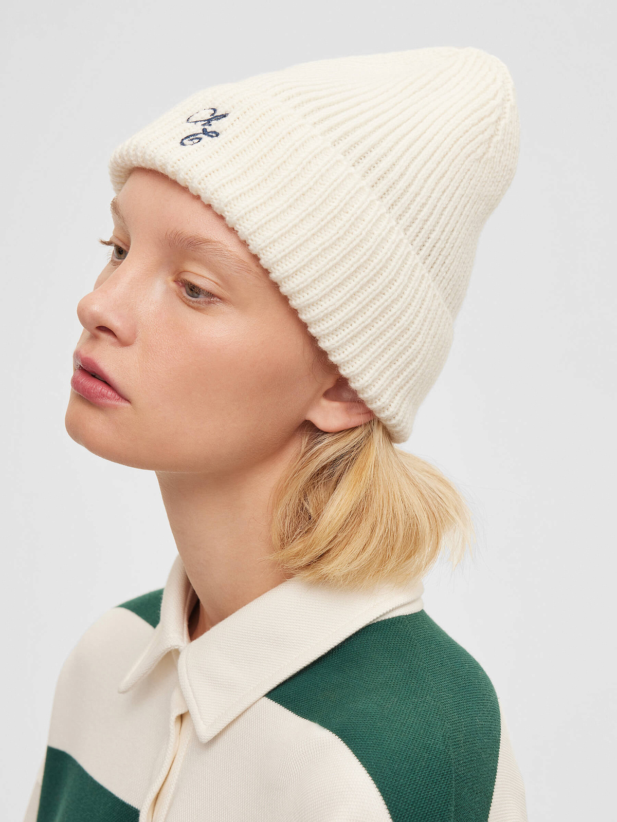 Шапка в рубчик с отворотом и вышивкой, молочный