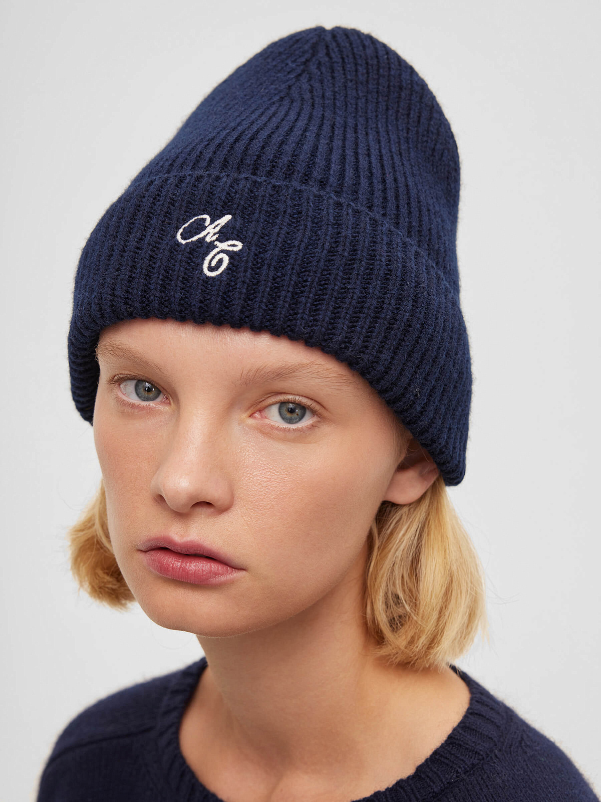 Шапка в рубчик с отворотом и вышивкой, темно-синий