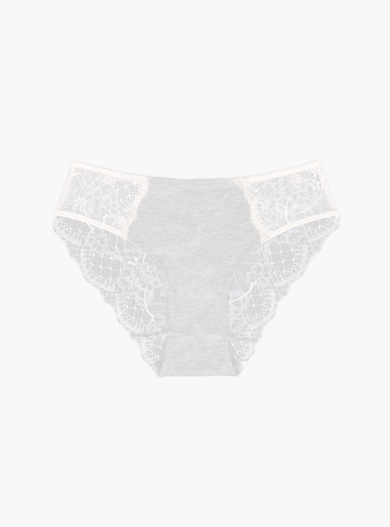 Женские трусы со средней посадкой сшиты из бамбуковой ткани. Передняя часть выполнена из гладкого трикотажа, задняя — из тонкого кружева с цветочным рисунком. Крой закрывает линию бедра и сидит ровно за счет эластичного пояса. Материал мягкий и гладкий и подходит для ежедневной носки.