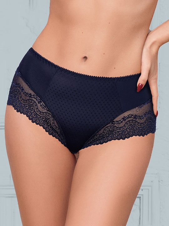 Ночная_тень 38, 40, 42, 44, 46, 48 Трусы-слип комфорт с завышенной линией талии. Выполнены из набивной микрофибры в точку, гладкой микрофибры и эластичного кружева. Полиамид 65%, Эластан 20%, Хлопок 15%