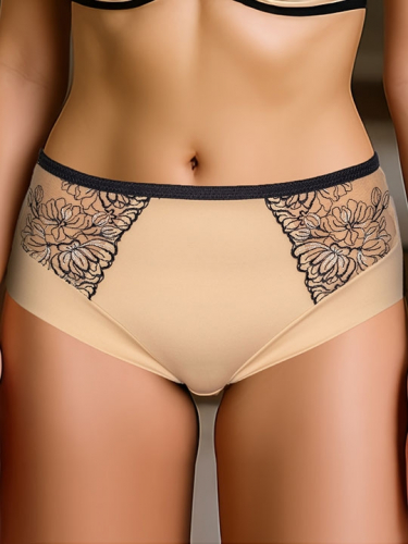 Миндаль/Черный 38, 44, 46, 48, 50 Трусы-слип 213 со средней линией талии. Выполнены из микрофибры и не эластичной вышивки. Срезы по краю ножек обработаны на плоскошовной машине. Полиамид 65%, Эластан 20%, Хлопок 15%