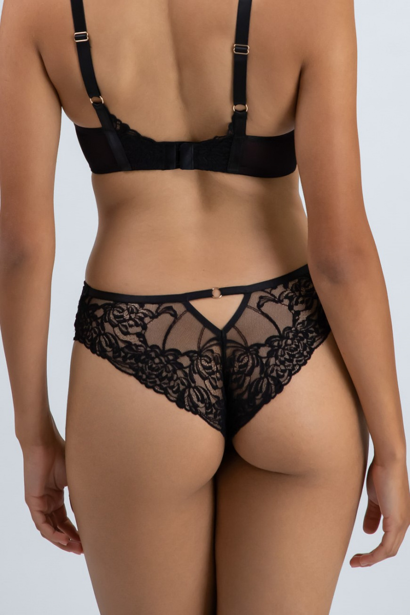 Трусики бразильяна из коллекции TruffleNoir выполнены из кружева, спереди вставка из черной сетки продублирована сеткой цвета трюфеля, на спинке V-образный вырез, фурнитура металлическая цвета желтого золота. Ластовица проложена 100% хлопком цвета трюфеля.