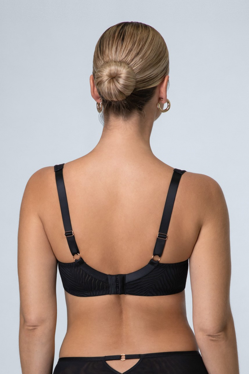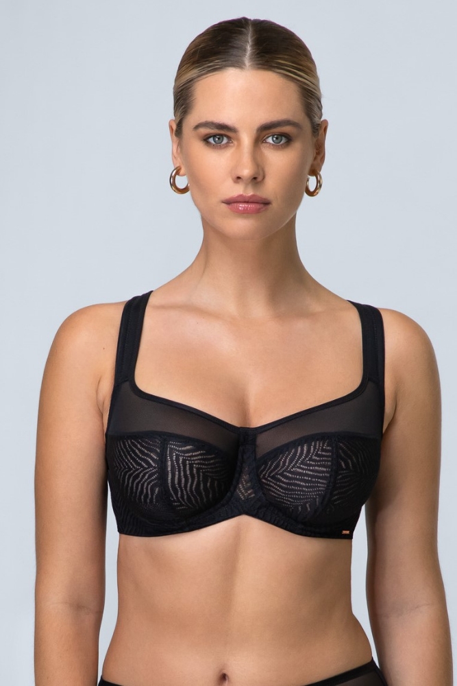 Бюстгальтер Aira M выполнен на косточках, чашки шитые, нижняя часть из кружевного полотна, продублированного сеткой в тон, верхняя часть из двух слоев сетки, спинка из кружевного полотна продублирована сеткой. Бретельки широкие не отстёгиваются, регулируются по длине, с тонким поролоном для комфорта. На спине застёжка на удлинитель на 3 крючка. Фурнитура металлическая цвета меди. Бюстгальтер идеально сочетается с трусиками Aira, Celeste.