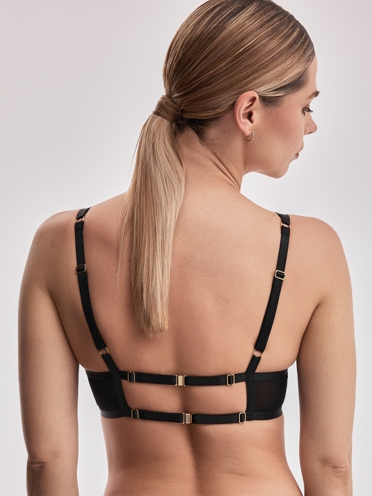 Бюстгальтер бралетт из коллекции Beverly M с мягкими чашечками на косточках, чашки шитые из кружева, продублированы черной сеткой, спинка из двух слоев черной сетки. Бретельки регулируются по длине, не отстёгиваются. На спине дополнительные боковые поддержки и двойные эластичные резинки, регулируемые по длине, с застежками-магнитами. Фурнитура металлическая цвета желтого золота. Окантовка косточек декорирована атласной лентой. Бюстгальтер идеально сочетается с трусиками из коллекции Beverly.