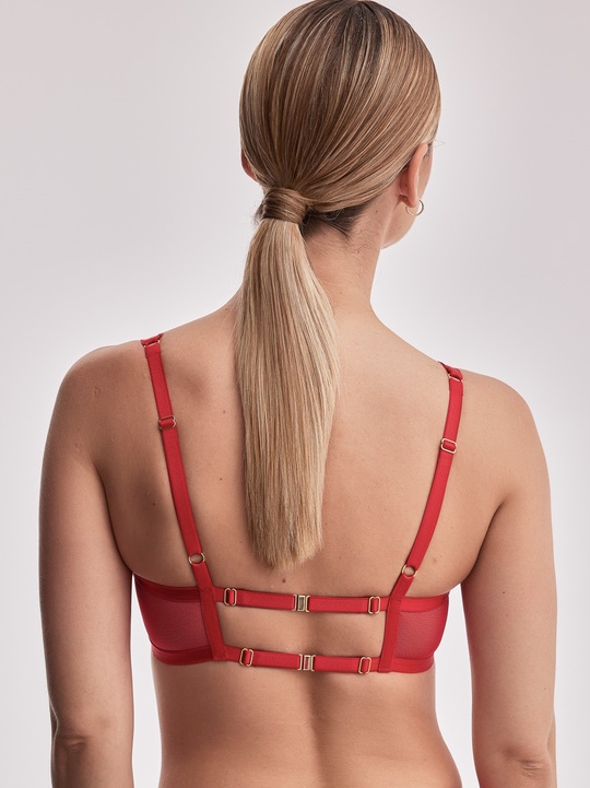 Бюстгальтер бралетт из коллекции Beverly M с мягкими чашечками на косточках, чашки шитые из роскошного кружева с растительным рисунком, продублированы телесной сеткой, спинка из красной сетки продублирована телесной сеткой. Бретельки регулируются по длине, не отстёгиваются. На спине дополнительные боковые поддержки и двойные эластичные резинки, регулируемые по длине, с застежками-магнитами. Фурнитура металлическая цвета золота. Бюстгальтер идеально сочетается с трусиками из коллекции Beverly.