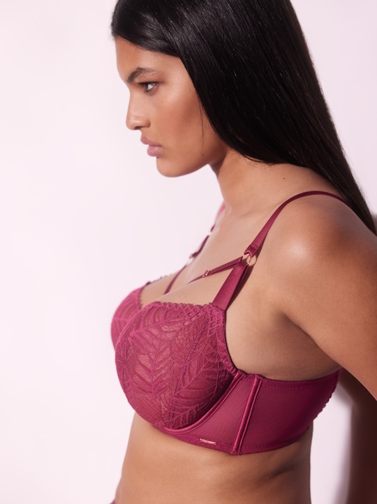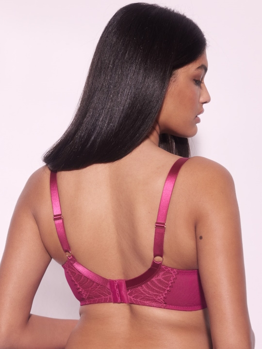 Бюстгальтер Beverly M выполнен в цвете фуксия на косточках (на каркасах), с дополнительными боковыми поддержками, чашки шитые мягкие, кружевные, продублированы сеткой в тон, с боковым подкроем. Косточки декорированы атласными лентами. Бретельки не отстёгиваются, регулируются по длине. На спине застёжка на удлинитель, количество крючков в ряду застёжки, увеличивается пропорционально размеру бюстгальтера. Спинка из сетки и кружева продублирована сеткой в тон. В зоне декольте дополнительные тонкие несъемные бретели, регулируются по длине, фурнитура металлическая цвета меди. Бюстгальтер идеально сочетается с трусиками Beverly.