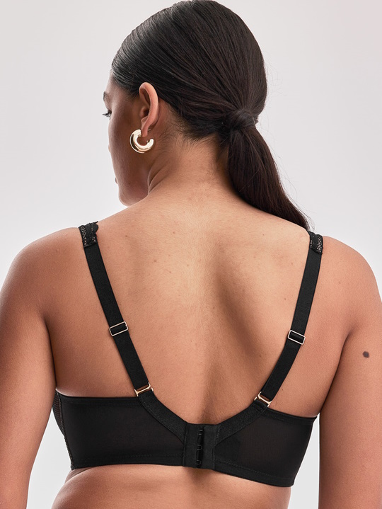 Бюстгальтер из коллекции Chita M с мягкими чашечками на косточках, чашки шитые, покрыты  кружевом, продублированы телесной тканью, с дополнительными боковыми поддержками. Бретельки регулируются по длине, не отстёгиваются. Спинка из черной сетки. На спине застёжка на удлинитель, количество крючков в ряду застёжки увеличивается пропорционально размеру бюстгальтера. Бюстгальтер идеально сочетается с трусиками из коллекции Chita.