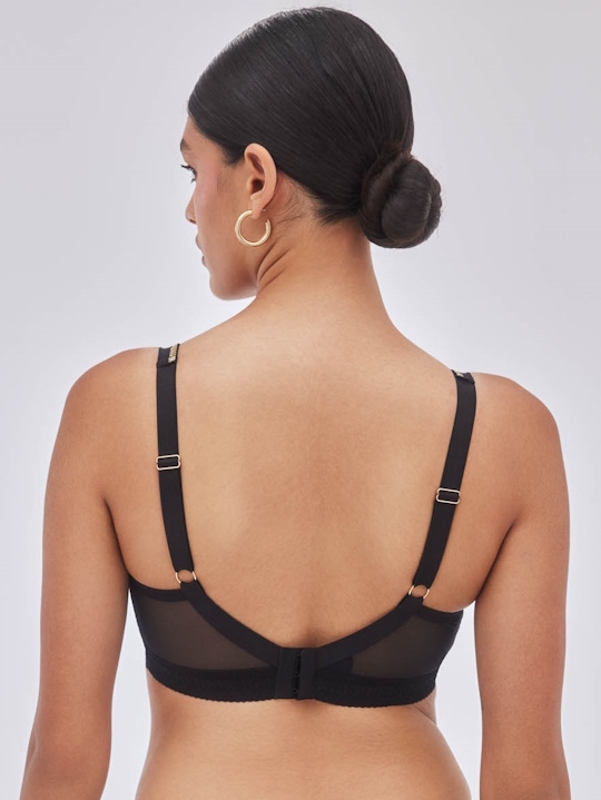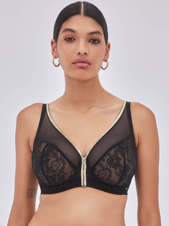 Бюстгальтер из коллекции Chiara M с мягкими чашечками на косточках, чашки шитые, из кружева и сетки, декорированы тесьмой с золотым люрексом. Бретельки регулируются по длине, не отстёгиваются. На спине застёжка на удлинитель, количество крючков в ряду застёжки увеличивается пропорционально размеру бюстгальтера. Бюстгальтер идеально сочетается с трусиками из коллекции Chiara.