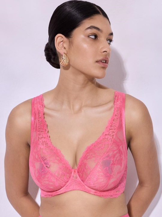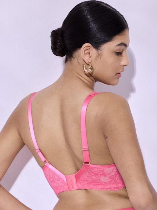 Бюст Coachella выполнен на основе бюста Bohemian Vibe M Plus Bralette, с мягкими чашечками на косточках (на каркасах), с дополнительными боковыми поддержками, чашки шитые из кружева, продублированы тканью в тон. Широкие бретели с подкладкой из мягкого пеноматериала регулируются по длине,  отстёгиваются на спине, фурнитура металлическая цвета меди. Спинка кружевная продублирована сеткой в тон. На спине застёжка на удлинитель, количество крючков в ряду застёжки увеличивается пропорционально размеру бюстгальтера. Бюстгальтер идеально сочетается с трусиками из коллекции Coachella.