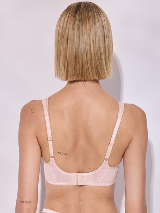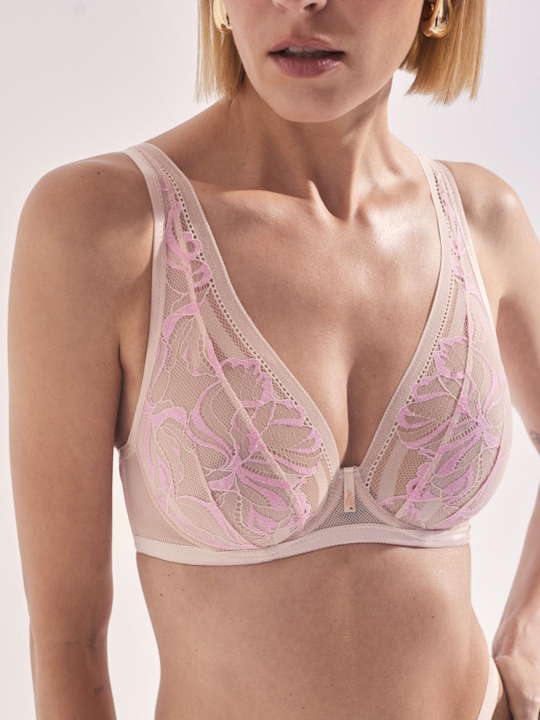 Бюстгальтер бралетт из коллекции Glossy Iris M выполнен с мягкими чашечками на косточках, с дополнительными боковыми поддержками, чашки шитые из нежного кружева с розовыми цветами, с эффектом мерцания, продублированы сеткой. Пояс из эластичного сетчатого полотна на подкладке из стабилизирующей сеточки. Бретели регулируются по длине, не отстёгиваются. На спине застёжка на удлинитель, количество крючков в ряду застёжки, увеличивается пропорционально размеру бюстгальтера. Фурнитура металлическая цвета меди. Бюстгальтер идеально сочетается с трусиками из коллекции Glossy Iris.