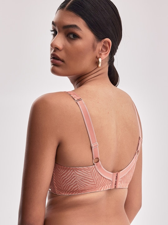 Бюстгальтер Celeste M выполнен в цвете лососевый розовый на косточках, с дополнительными боковыми поддержками, чашки шитые из кружевного полотна, продублированы сеткой в тон. Спинка из кружева продублирована телесной сеткой. Бретельки широкие не отстёгиваются, регулируются по длине, с тонким поролоном для комфорта. На спине застёжка на удлинитель на 3 крючка. Фурнитура металлическая цвета меди. Бюстгальтер идеально сочетается с трусиками Celeste.