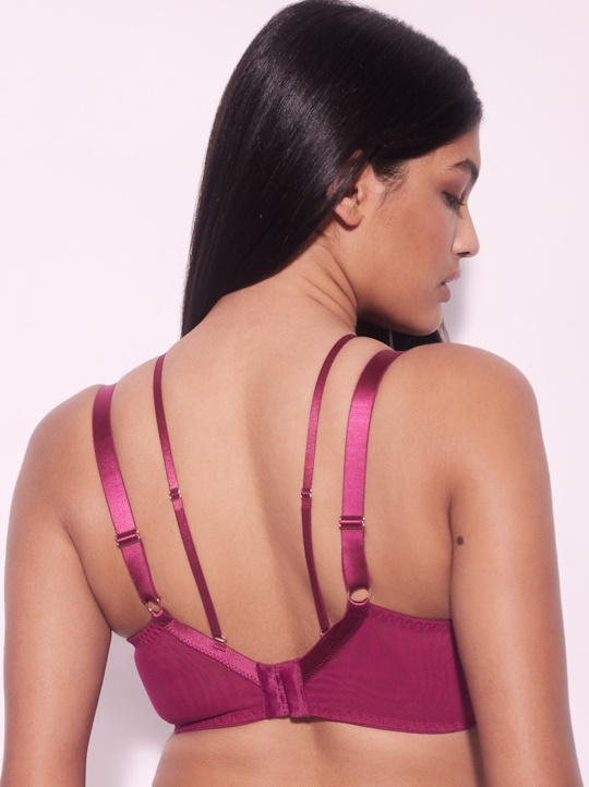Бюстгальтер из коллекции Chiara M выполнен в цвете фуксия с мягкими чашечками на косточках, чашки шитые, из кружева, продублированы телесной сеткой, декорированы тесьмой в тон. Спинка из стабилизирующей сетки. Бретельки регулируются по длине, не отстёгиваются. В зоне декольте дополнительные съемные тонкие бретели, регулируются по длине, крепятся между чашками и на спинке, при желании их можно перекрещивать на спине. На спине застёжка на удлинитель, количество крючков в ряду застёжки увеличивается пропорционально размеру бюстгальтера, фурнитура металлическая цвета меди. Бюстгальтер идеально сочетается с трусиками из коллекции Chiara.
