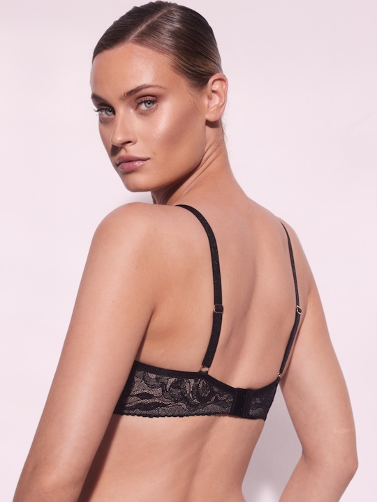 Бюстгальтер Frozen Black P-UP выполнен на косточках, с дополнительными боковыми поддержками, чашки шитые на тонком поролоне телесного цвета, со съёмными пуш-ап вкладышами, внешняя сторона покрыта нежным кружевом с черными цветами, с эффектом мерцания. Спинка из кружева продублирована телесной сеткой. Бретельки с эффектом мерцания не отстёгиваются, регулируются по длине. На спине застёжка на удлинитель, фурнитура металлическая цвета меди. Бюстгальтер идеально сочетается с трусиками Frozen Black.
