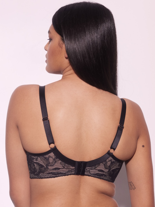Бюстгальтер Frozen Black PU выполнен на косточках, с дополнительными боковыми поддержками, чашки шитые, нижняя часть на тонком поролоне телесного цвета, внешняя сторона и верхняя покрыты нежным кружевом с черными цветами, с эффектом мерцания. Спинка из кружева продублирована телесной сеткой. Бретельки с эффектом мерцания не отстёгиваются, регулируются по длине. На спине застёжка на удлинитель, фурнитура металлическая цвета меди. Бюстгальтер идеально сочетается с трусиками Frozen Black.