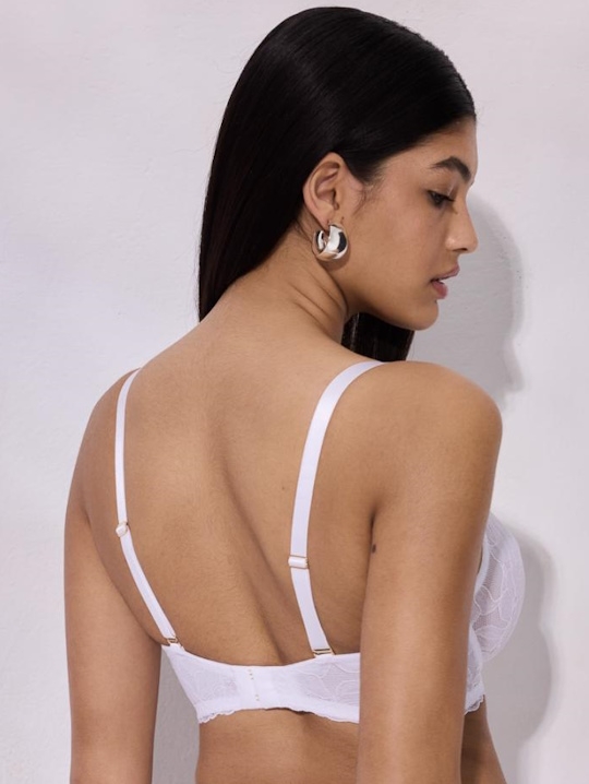 Бюстгальтер из коллекции Glow M выполнен с мягкими чашечками на косточках (на каркасах), чашки шитые из роскошного кружева с цветочным рисунком и легким мерцающим эффектом, продублированы тканью в тон. Бретельки регулируются по длине, не отстёгиваются. На спине застёжка на удлинитель, количество крючков в ряду застёжки увеличивается пропорционально размеру бюстгальтера, пояс из сетки в  крапинку  продублирован сетчатой тканью. Фурнитура металлическая цвета желтого золота. Между чашек украшение в виде красивой подвески и атласной ленты. Бюстгальтер идеально сочетается с трусиками из коллекции Glow.