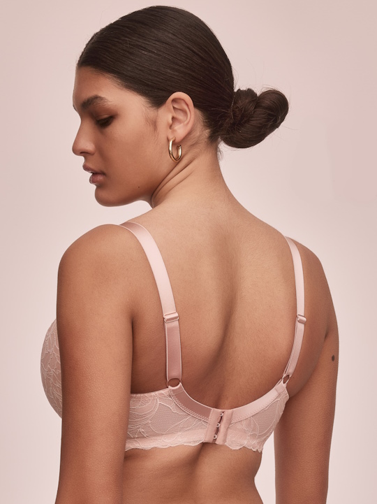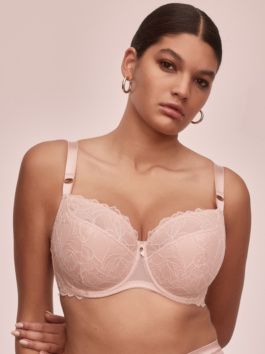 Бюст Glow PU выполнен на основе бюста CHITA PU  на косточках, с дополнительными боковыми поддержками, чашки шитые, нижняя часть на тонком поролоне цвета пудры, с внешней стороны из кружева в легким мерцающим эффектом, внутренняя сторона проложена хлопковым трикотажем, верхняя часть кружевная, продублирована сеткой в тон. Бретельки не отстёгиваются, регулируются по длине, фурнитура металлическая цвета меди. Спинка кружевная продублирована сеткой. На спине застёжка на удлинитель, количество крючков в ряду застёжки, увеличивается пропорционально размеру бюстгальтера. Бюстгальтер идеально сочетается с трусиками Glow.