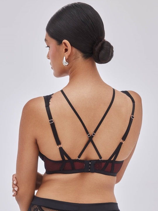 Бюстгальтер бралетт из коллекции Heartbeat M выполнен на основе бюста Marie M Bralette/Glow M Braletteс мягкими чашечками на косточках (на каркасах), с дополнительными боковыми поддержками, чашки шитые из роскошного кружева с цветочным рисунком, продублированы бордовой сеткой. Бретельки регулируются по длине, не отстёгиваются. В зоне декольте дополнительные съемные тонкие бретели, регулируются по длине, крепятся между чашками и на спинке. На спине застёжка на удлинитель, количество крючков в ряду застёжки увеличивается пропорционально размеру бюстгальтера, пояс из сетки продублирован бордовой сеткой. Фурнитура металлическая цвета розового золота. Между чашек украшение в виде красивой подвески с кристаллом цвета сапфира и атласной ленты. Бюстгальтер идеально сочетается с трусиками из коллекции Heartbeat.