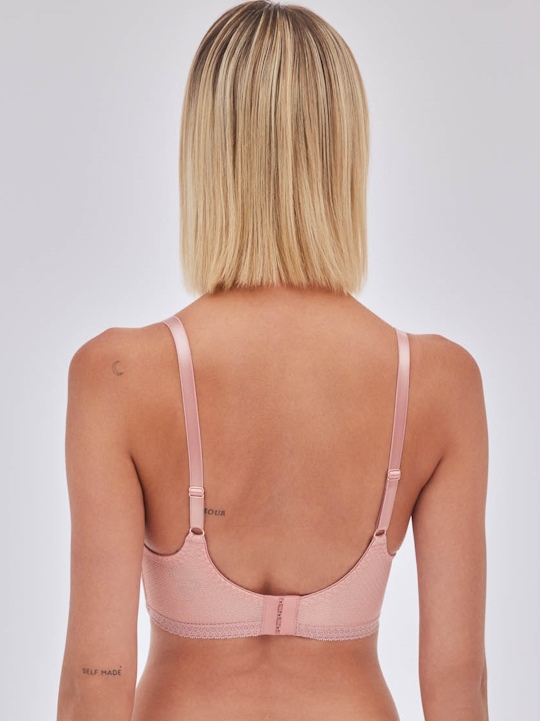 Бюстгальтер из коллекции NudeRose Super P-UP выполнен на основе бюста Marie super P-UP/Glow super P-UP с формованными поролоновыми чашками телесного цвета без косточек, с дополнительными боковыми поддержками, внешняя сторона покрыта кружевом с цветочным рисунком. Спинка из декоративной сетки продублирована телесной сеткой. Бретельки не отстёгиваются, регулируются по длине. На спине застёжка на удлинитель, количество крючков в ряду застёжки увеличивается пропорционально размеру бюстгальтера. Фурнитура металлическая цвета розового золота. Бюстгальтер идеально сочетается с трусиками из коллекции NudeRose.