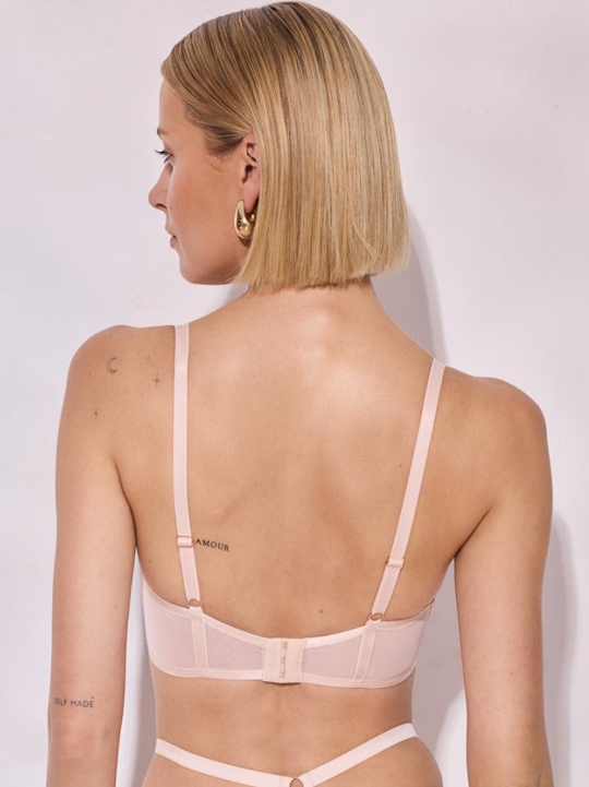 Бюстгальтер из коллекции Glossy Iris P-UP выполнен с формованными поролоновыми чашками телесного цвета без косточек, покрытыми нежным кружевом с розовыми цветами с эффектом мерцания, с дополнительными боковыми поддержками для предотвращения скручивания. Бретельки не отстёгиваются, регулируются по длине. На спине застёжка на удлинитель, количество крючков в ряду застёжки увеличивается пропорционально размеру бюстгальтера. Пояс из эластичной телесной сетки на подкладке из стабилизирующей сеточки. Фурнитура металлическая цвета розового золота. Бюстгальтер идеально сочетается с трусиками из коллекции Glossy Iris.