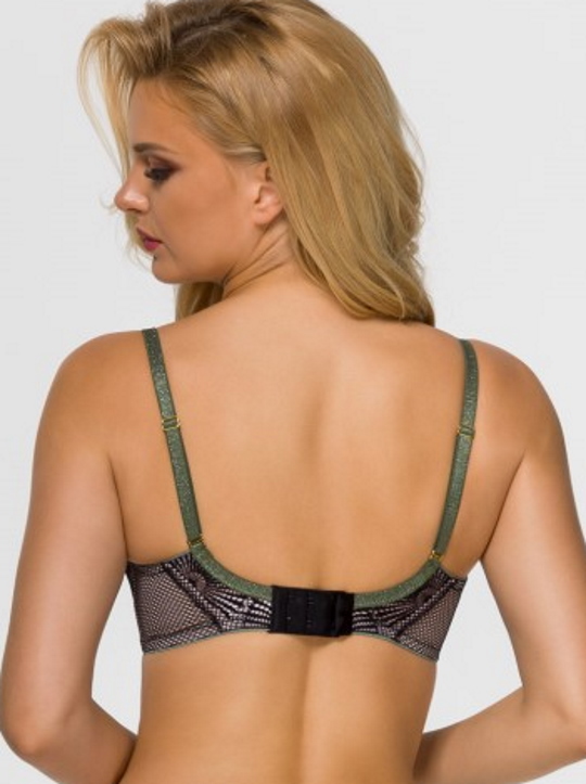 Бюстгальтер Prima U на косточках, с дополнительными боковыми поддержками, чашки шитые на тонком поролоне, внутренняя сторона проложена хлопковым трикотажем, внешняя цвета пудры покрыта чёрным кружевом. Бретельки отстёгиваются, регулируются по длине. На спине застёжка на удлинитель, количество крючков в ряду застёжки, увеличивается пропорционально размеру бюстгальтера. Бюстгальтер идеально сочетается с трусиками Prima.
