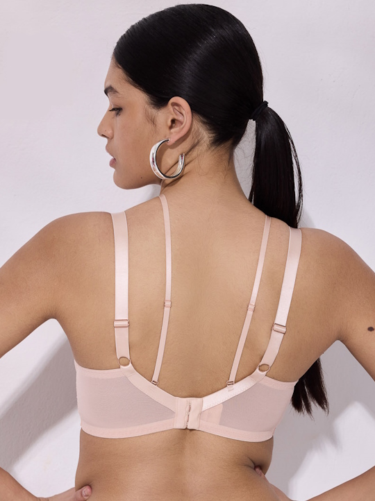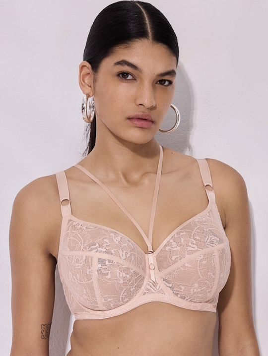 Бюстгальтер из коллекции Chiara M выполнен в телесном цвете с мягкими чашечками на косточках, чашки шитые из кружева, продублированы сеткой в тон, декорированы тесьмой. Спинка из стабилизирующей сетки. Бретельки регулируются по длине, не отстёгиваются. В зоне декольте дополнительные съемные тонкие бретели, регулируются по длине, крепятся между чашками и на спинке, при желании их можно перекрещивать на спине. На спине застёжка на удлинитель, количество крючков в ряду застёжки увеличивается пропорционально размеру бюстгальтера, фурнитура металлическая цвета меди. Бюстгальтер идеально сочетается с трусиками из коллекции Chiara.