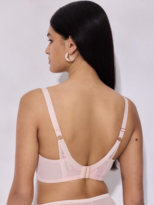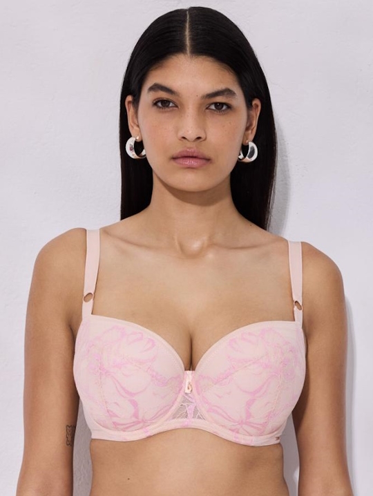 Бюстгальтер Glossy Iris U/W выполнен на косточках, чашки шитые на тонком поролоне, со съёмными пуш-ап вкладышами, внешняя сторона покрыта нежным кружевом с розовыми цветами, с эффектом мерцания. Спинка из сетки. Бретельки не отстёгиваются, регулируются по длине. На спине застёжка на удлинитель, количество крючков в ряду застёжки, увеличивается пропорционально размеру бюстгальтера, фурнитура металлическая цвета меди. Бюстгальтер идеально сочетается с трусиками Glossy Iris.