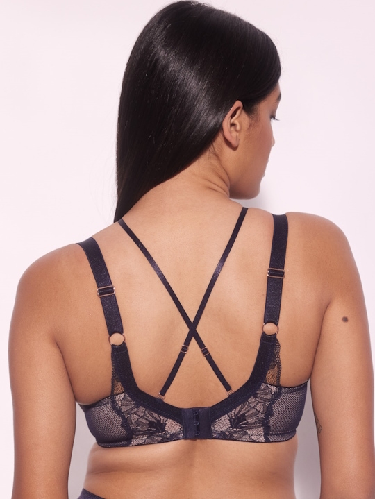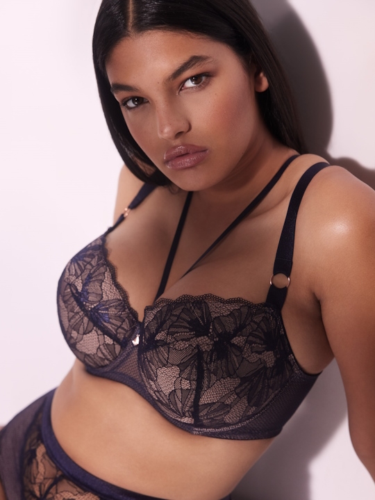 Бюстгальтер Volare U/W выполнен в темно-синем цвете на косточках, чашки шитые на тонком поролоне телесного цвета, со съёмными пуш-ап вкладышами, внешняя сторона богато декорирована нежным цветочным кружевом. Пояс из эластичного сетчатого кружевного полотна на контрастной подкладке из стабилизирующей сеточки телесного цвета. Бретельки не отстёгиваются, регулируются по длине. На спине застёжка на удлинитель, количество крючков в ряду застёжки, увеличивается пропорционально размеру бюстгальтера, фурнитура металлическая цвета меди. В зоне декольте дополнительные съемные тонкие бретели, регулируются по длине, крепятся между чашками и на спинке, Бюстгальтер идеально сочетается с трусиками Volare.