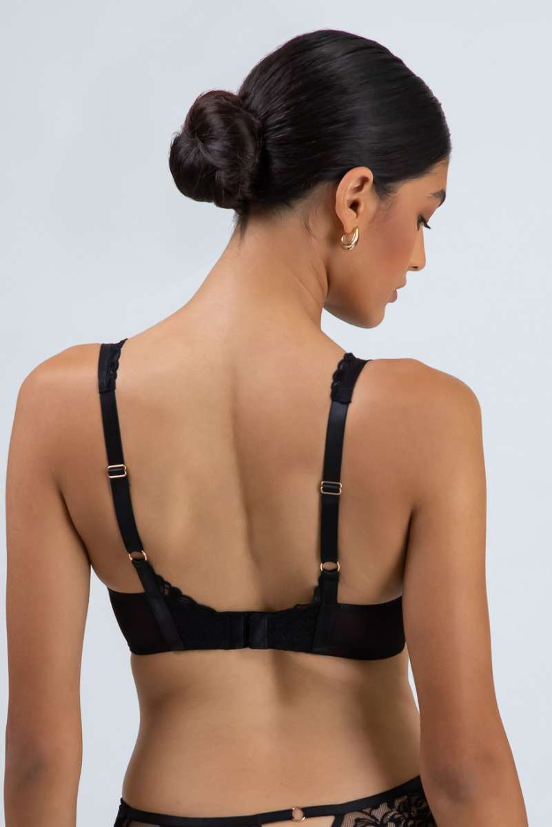 Бюстгальтер-бралетт из коллекции TruffleNoir выполнен на основе бюста Sublime с мягкими, шитыми из роскошного черного кружева чашками, продублированными сеткой цвета трюфеля, на косточках, с дополнительными боковыми поддержками. Пояс из черной сетки продублирован сеткой цвета трюфеля. Бретели регулируются по длине, не отстёгиваются. На спине застёжка на удлинитель, количество крючков в ряду застёжки увеличивается пропорционально размеру бюстгальтера, фурнитура металлическая цвета желтого золота. Бюстгальтер идеально сочетается с трусиками из коллекции TruffleNoir.