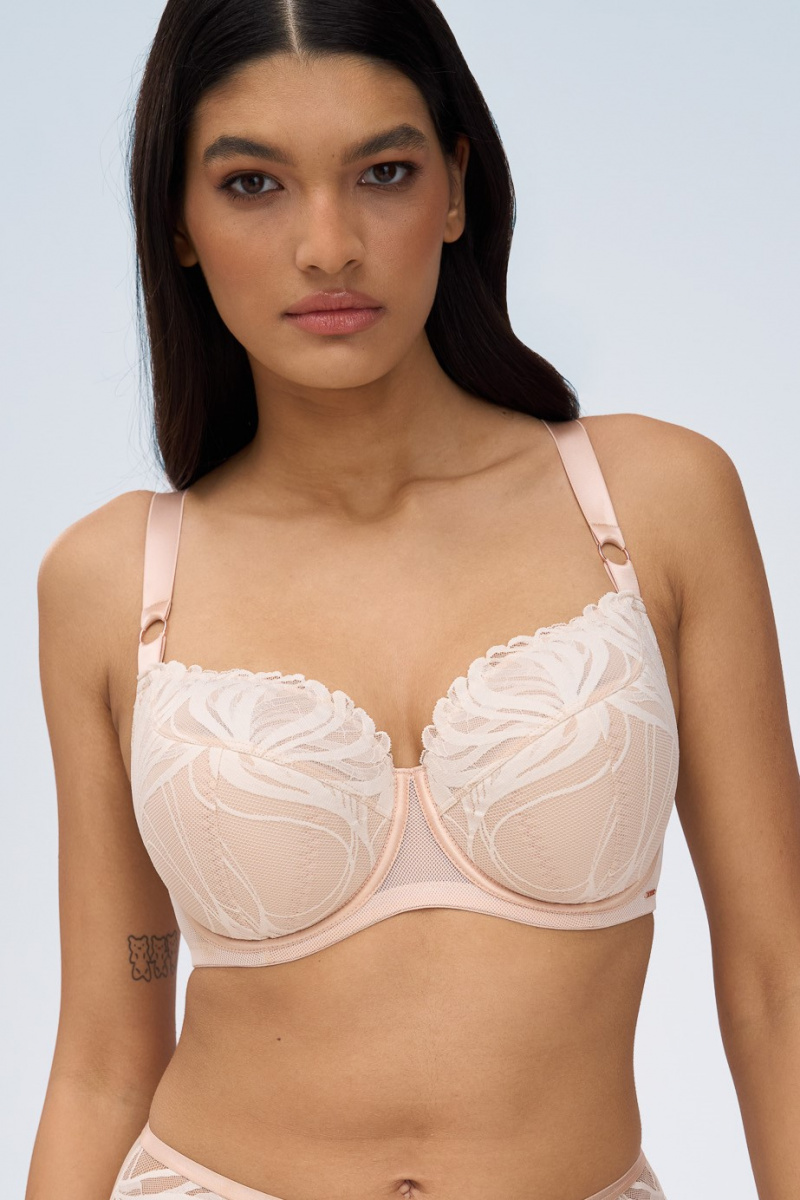 Бюстгальтер CremeBrulee PU выполнен на основе бюста Glow PU на косточках (на каркасах), с дополнительными боковыми поддержками, чашки шитые, нижняя часть на тонком поролоне телесного цвета, с внешней стороны из кружева, внутренняя сторона проложена хлопковым трикотажем, верхняя часть кружевная, окантовка косточек на чашках декорирована атласной лентой, пояс из сетки продублирован эластичной телесной сеткой. Бретельки не отстёгиваются, регулируются по длине. На спине застёжка на удлинитель, количество крючков в ряду застёжки, увеличивается пропорционально размеру бюстгальтера, фурнитура металлическая цвета розового золота. Бюстгальтер идеально сочетается с трусиками CremeBrulee. Вдохновлённая культовым французским десертом, коллекция CremeBrulee сочетает в себе тёплые, ванильные оттенки кружева с мерцающим бежево-золотым атласом, чей блеск напоминает карамельную глазурь.