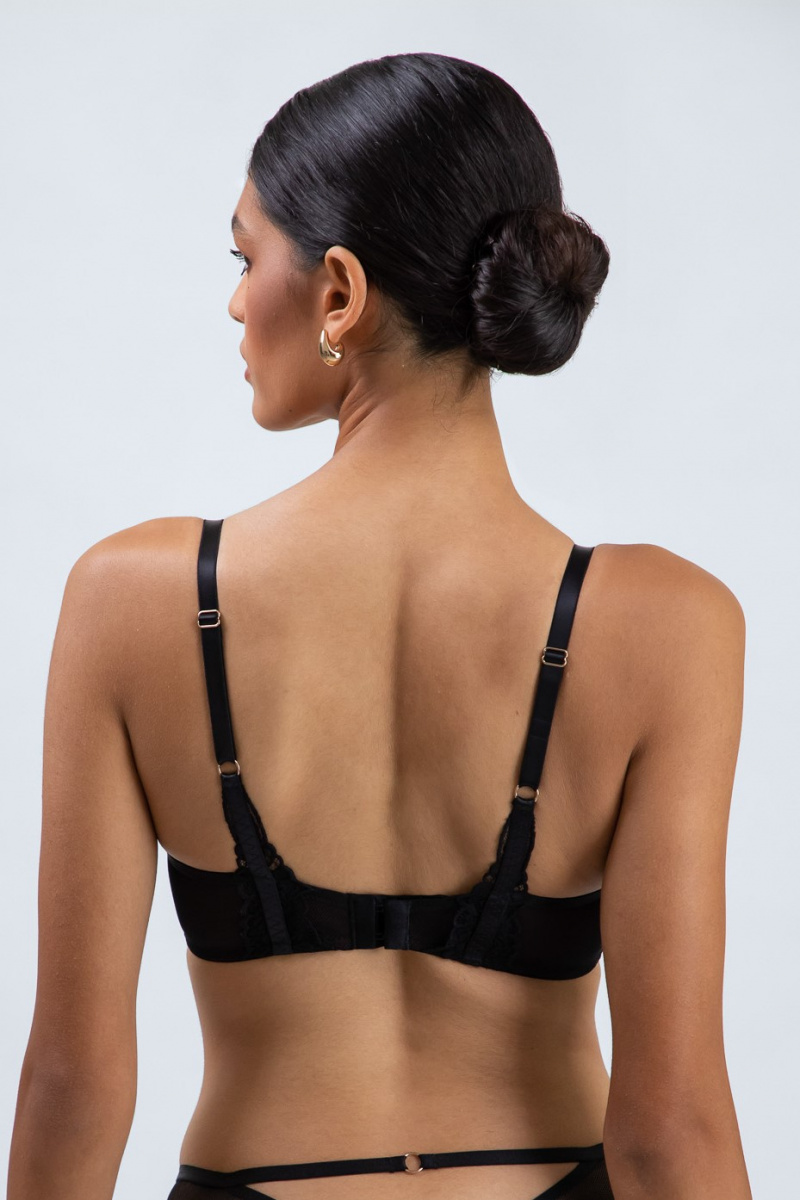 Бюстгальтер TruffleNoir выполнен на основе бюста Sublime P-UP, косточках (на каркасах), с дополнительными боковыми поддержками, чашки шитые на тонком поролоне цвета трюфеля, со съёмными пуш-ап вкладышами, внешняя сторона чашки из роскошного кружева, пояс из черной сетки продублирован эластичной сеткой цвета трюфеля. Бретельки не отстёгиваются, регулируются по длине. На спине застёжка на удлинитель, количество крючков в ряду застёжки, увеличивается пропорционально размеру бюстгальтера, фурнитура металлическая цвета желтого золота. Бюстгальтер идеально сочетается с трусиками TruffleNoir.