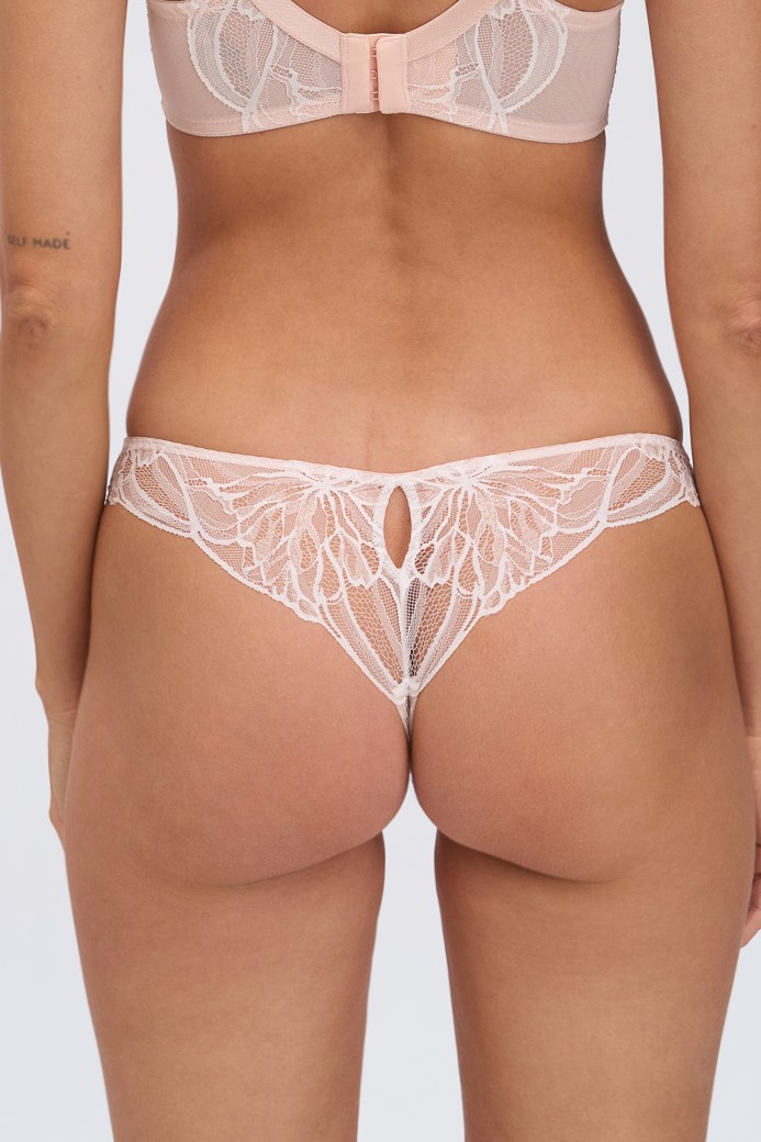 Трусики стринг из коллекции FizzyDelight выполнены из кружевного полотна с легким мерцанием, на спинке каплеобразный вырез. Ластовица проложена 100% хлопком цвета пудры.