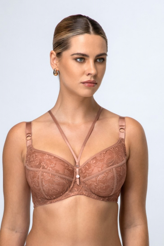 Трусики стринг из коллекции TruffleNoir выполнены из кружева и черной сетки, спереди продублированы сеткой цвета трюфеля, на спинке V-образный вырез, фурнитура металлическая цвета желтого золота. Ластовица проложена 100% хлопком цвета трюфеля.