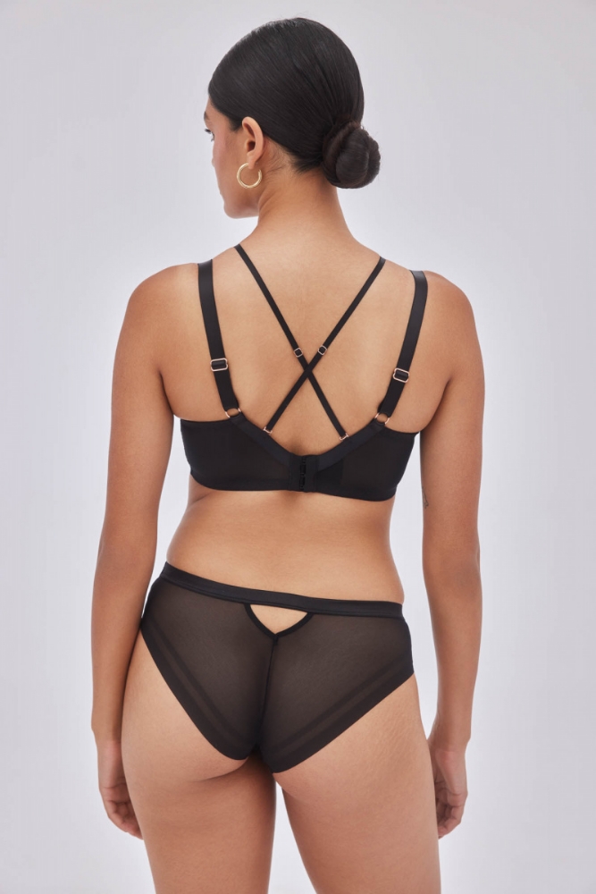 Трусики бразильяна из коллекции Chiara выполнены из сетки, сложенной вдвое, спереди кружевная вставка, на спинке V-образный вырез. Ластовица проложена 100% хлопком.