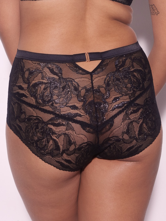 Трусики слип с завышенной линией талии из коллекции Frozen Black выполнены из эластичного кружевного полотна с эффектом мерцания и сетки, спереди продублированы телесной сеткой, на спинке V-образный вырез, фурнитура металлическая цвета меди. Ластовица из 100% хлопка телесного цвета. Идеально сочетаются с бюстгальтерами Frozen Black.