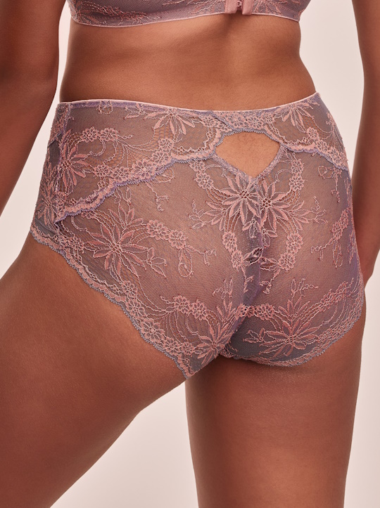 Трусики классические с высокой талией из коллекции Madera выполнены из роскошного сиренево-розового кружева с цветочным узором, спереди продублированы телесной сеткой, на спинке вырез. Ластовица проложена 100% хлопком.