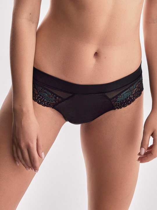 Трусики бразильяна из коллекции Moon спереди  из эластичного черно-зеленого кружевного полотна, черной сетки и атласной ткани, продублированной хлопковым трикотажем, спинка из кружева. Пояс из атласной ткани. Идеально сочетаются с бюстгальтерами Moon.