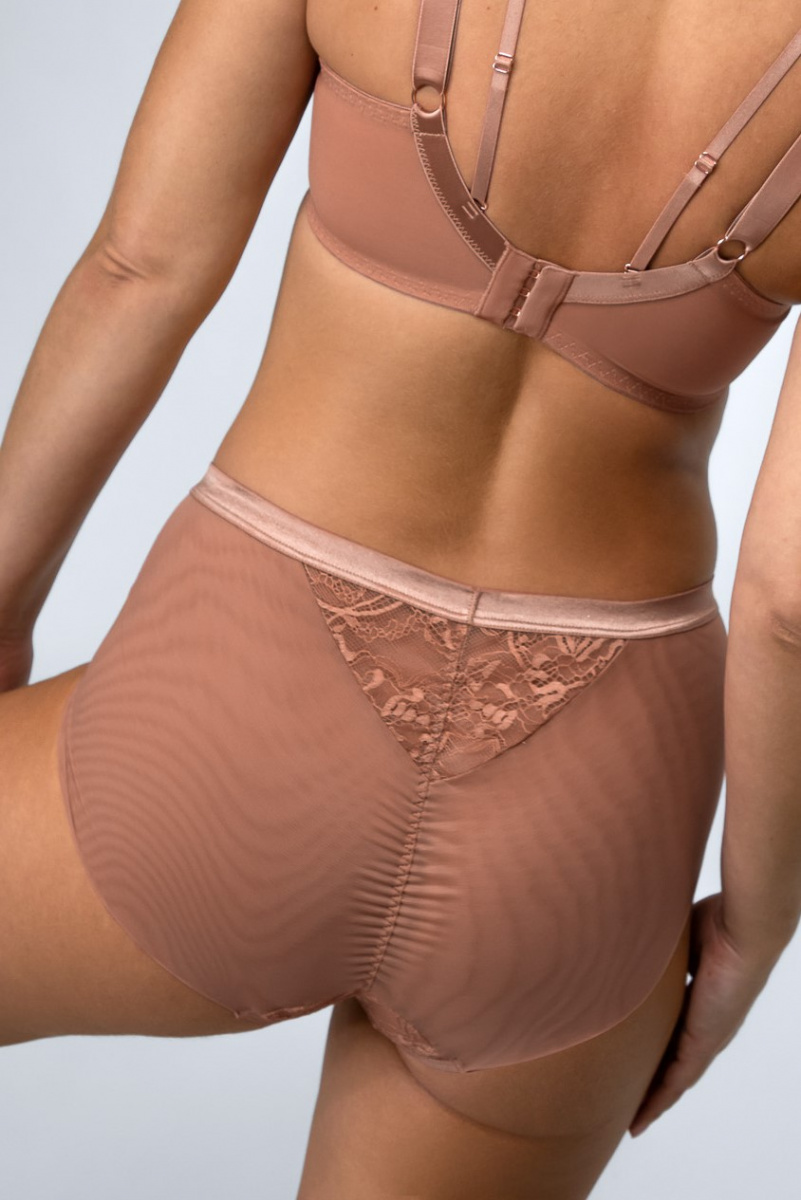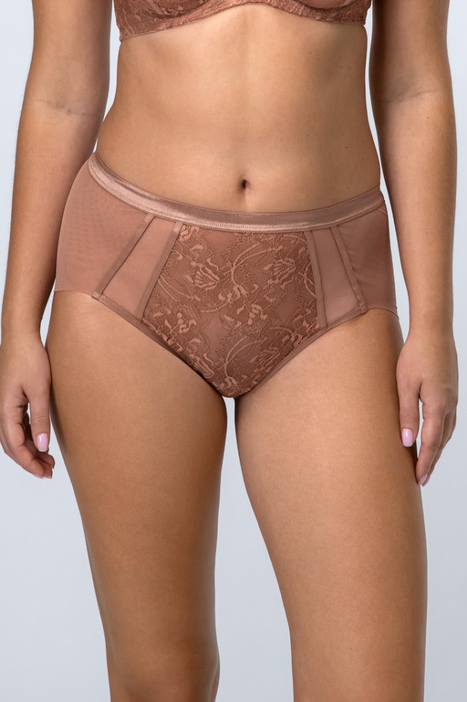 Трусики классические с высокой талией из коллекции Chiara выполнены из кружевного полотна, продублированного сеткой, спинка из сетки, сложенной вдвое, с V-образной вставкой кружева, на спинке вертикально присборены. Ластовица проложена 100% хлопком.
