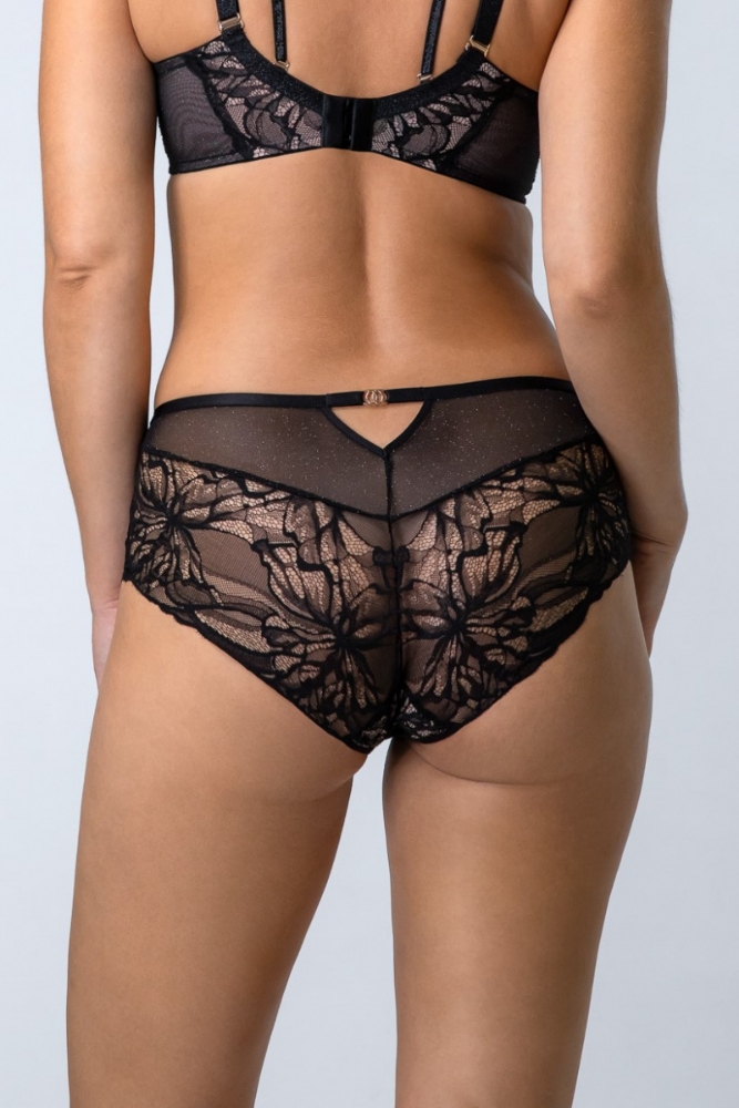 Трусики слип с завышенной талией из коллекции The Icon выполнены из кружева и сетки с эффектом мерцания, спереди продублированы телесной сеткой, на спинке V-образный вырез, фурнитура металлическая цвета желтого золота. Ластовица проложена 100% хлопком телесного цвета.