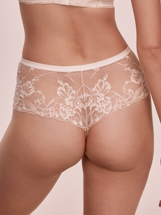 Трусики стринг с завышенной линией талии из коллекции Sublime выполнены из эластичного кружевного полотна, спереди продублированы телесной сеткой. Ластовица из 100% хлопка телесного цвета. Идеально сочетаются с бюстгальтерами Sublime.