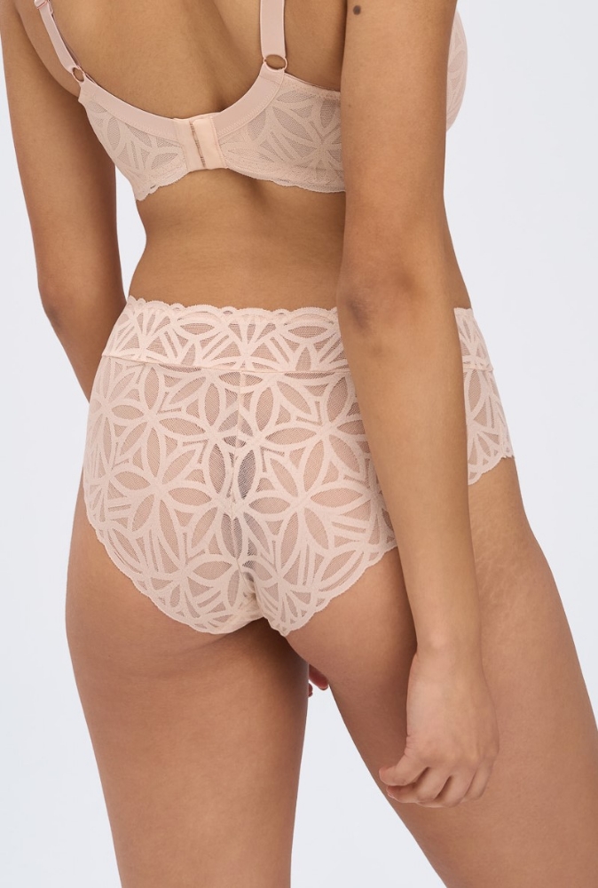 Трусики слип из коллекции SugarDune выполнены из роскошного кружева с геометрическим узором. Ластовица проложена 100% хлопком телесного цвета. Натуральная палитра делает бельё практически невидимым на коже, а плоское плетение кружева гарантирует его незаметность под одеждой, геометрический узор кружева напоминает мягкие линии дюн, созданных из карамельно-пудрового песка.