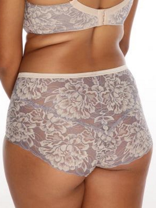 Трусики слип с высокой линией талии из коллекции Vulcano из серо-бежевого кружевного полотна, спереди продублированы телесной сеткой, резинка телесная. Ластовица проложена 100% хлопком.