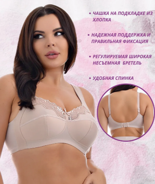 Бюстгальтер из эластичного полотна, трикотажного полотна и кружевного неэластичного полотна, без каркасов, с комфортными широкими бретелями. Нижняя деталь чашек на подкладке из хлопка.