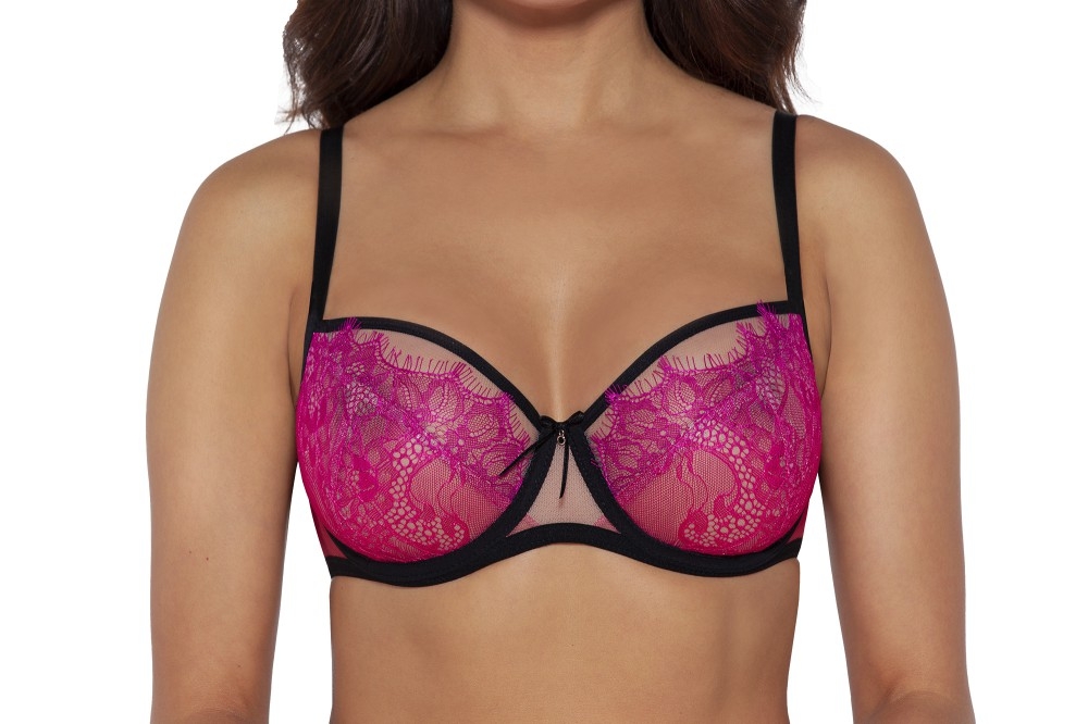 РОЗОВЫЙ 65E, 65G, 70E, 70F, 70G, 70I, 75B, 105C Бюстгальтер 2033 M в цвете Pink (Розовый) выполнен на косточках, чашки шитые из сетки телесного цвета, снаружи чашка покрыта ярко-розовым кружевом с ресничками , спинка из телесной сетки, резинки, окантовки чашек и бретели контрастного черного цвета. Бретельки бюста не отстёгиваются, регулируются по длине, фурнитура металлическая цвета меди. На спине застёжка на удлинитель, количество крючков в ряду застёжки увеличивается пропорционально размеру бюстгальтера. Бюстгальтер идеально сочетается с трусиками 2031, 2032, 2033. полиамид 88%, хлопок 8%, эластан 4%