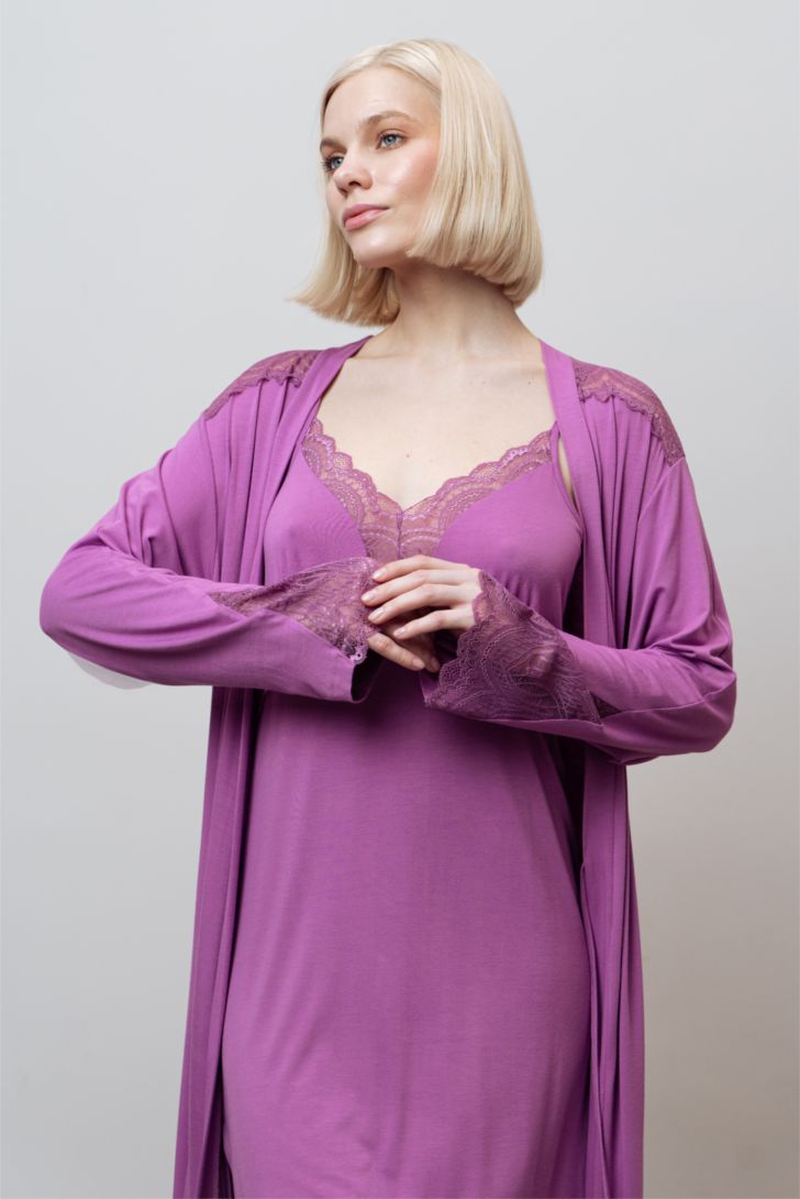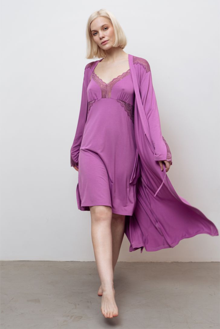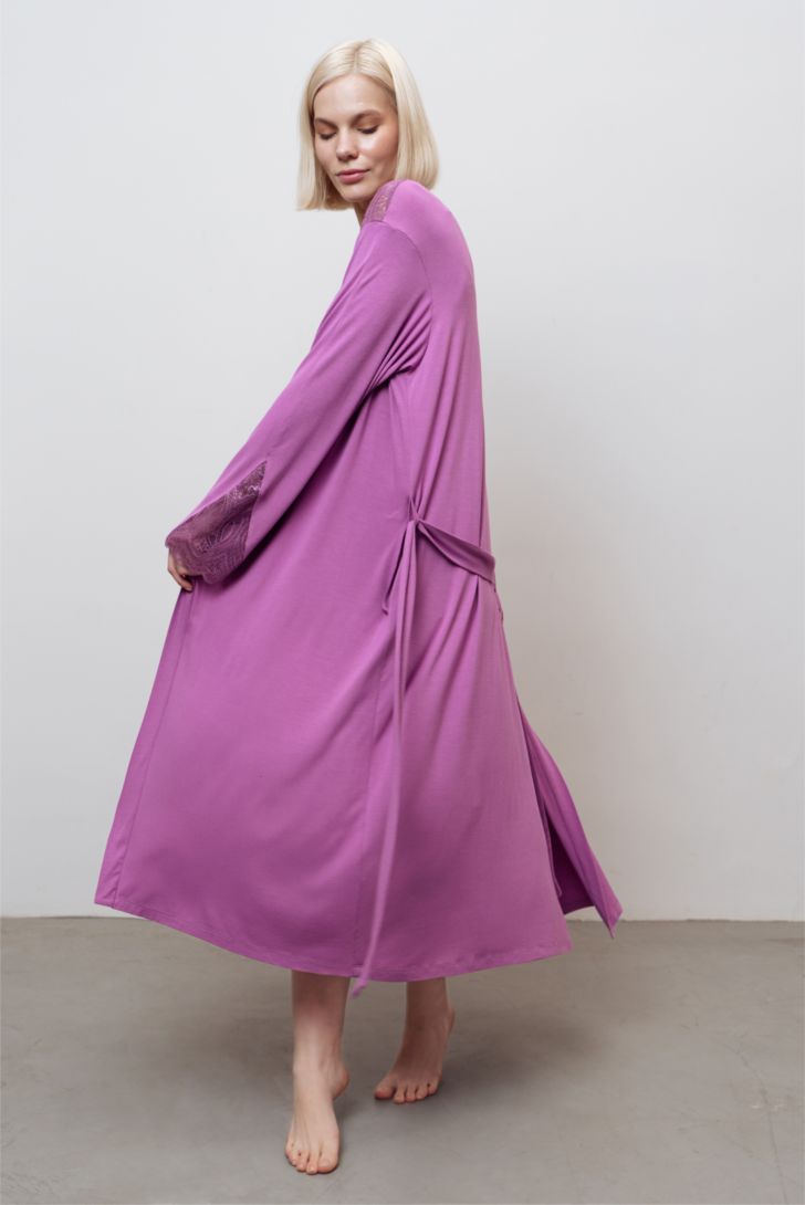 Пеньюар оформлен с любовью и вниманием к деталям — от тончайшего кружевного декора до струящихся линий, которые плавно подчеркивают силуэт. Линия плеча приспущена, в боковых швах карманы. Длина изделия позволяет надеть под него любую сорочку или пижаму из данной коллекции. Модель представлена в лиловом цвете."