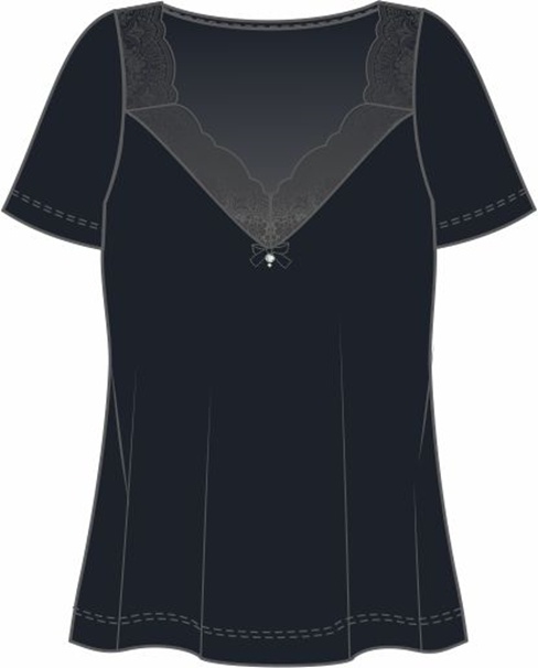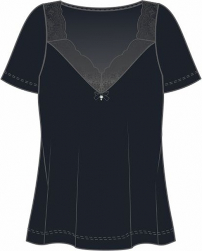 Футболка с короткими рукавами свободного прилегания. Вырез горловины декорирован нежным кружевом. Модель представлена в двух цветовых решениях. Дополнит образ к любому поясному изделию из данной коллекции, создав прекрасный комплект."