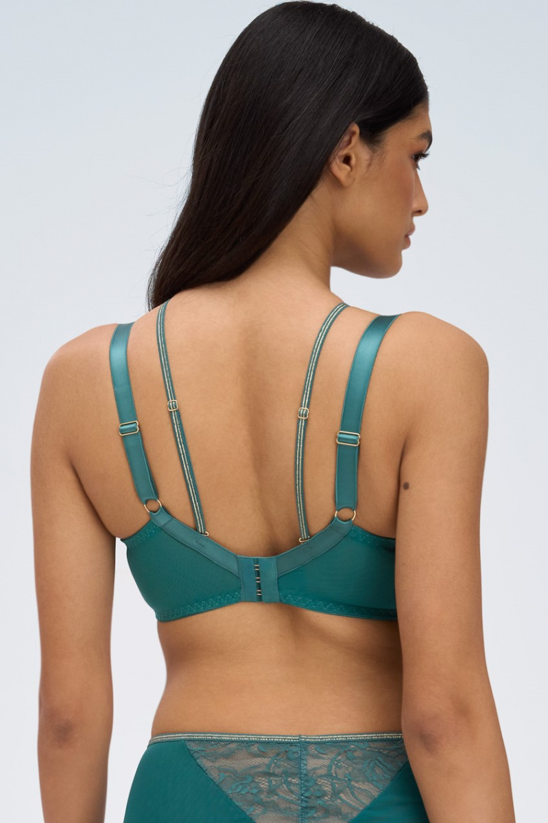Бюстгальтер из коллекции Chiara M выполнен в насыщенном летнем зелёном цвете с глубокими голубыми оттенками с мягкими чашечками на косточках, чашки шитые, из кружева, продублированы телесной сеткой, декорированы тесьмой в тон. Спинка из двух слоев стабилизирующей сетки. Бретельки регулируются по длине, не отстёгиваются. В зоне декольте дополнительные съемные тонкие бретели, регулируются по длине, крепятся между чашками и на спинке, при желании их можно перекрещивать на спине. На спине застёжка на удлинитель, количество крючков в ряду застёжки увеличивается пропорционально размеру бюстгальтера, фурнитура металлическая цвета желтого золота. Золотая люрексовая нить проходит через всю коллекцию, добавляя ей утончённого блеска и благородства. Бюстгальтер идеально сочетается с трусиками из коллекции Chiara.
