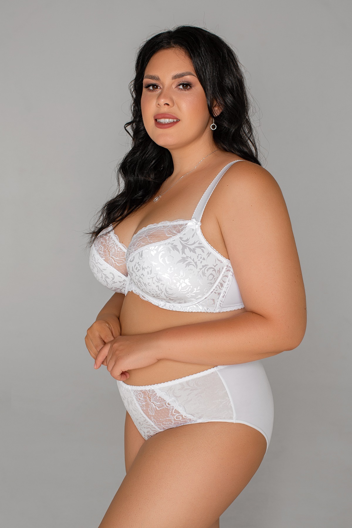 Комбинированная чашка из эластичного кружева и принтованного полотна. Низ чашки дублирован поролоном. На каркасах. Боковые детали усилены стержнями.