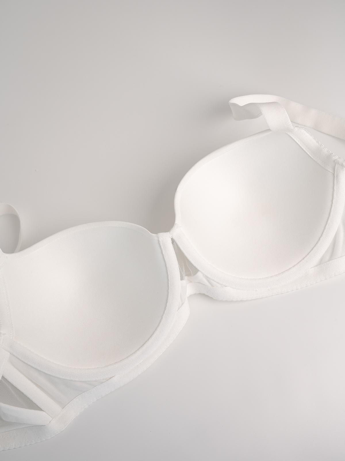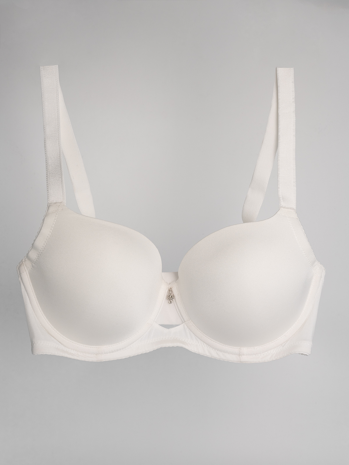 Элегантный женский бюстгальтер белого цвета с изысканным украшением из бижутерного сплава на передней части.