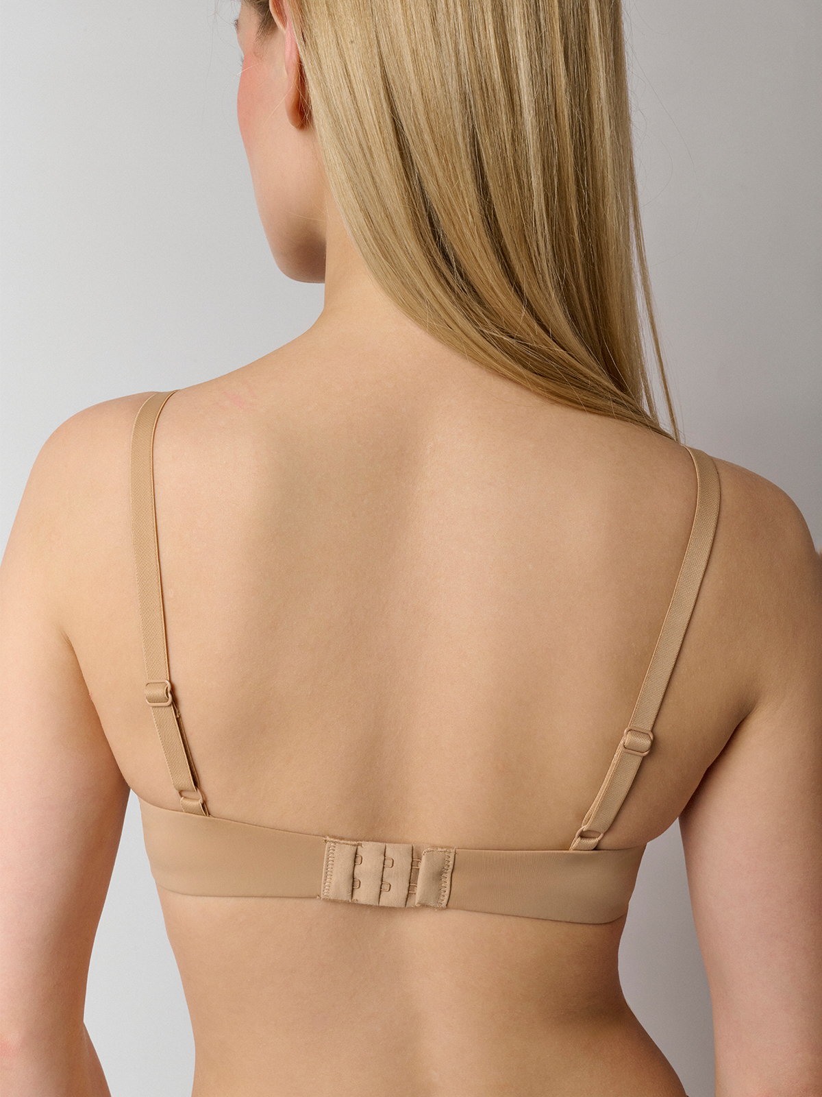 Гладкий бюстгальтер без косточек — универсальная модель, в которой комфортно в течение всего дня. Чашки без каркасов и push up мягко поддерживают и придают округлую, естественную форму груди. Длина пояса регулируется тонкими бретелями. Сшит из эластичной дышащей ткани.
